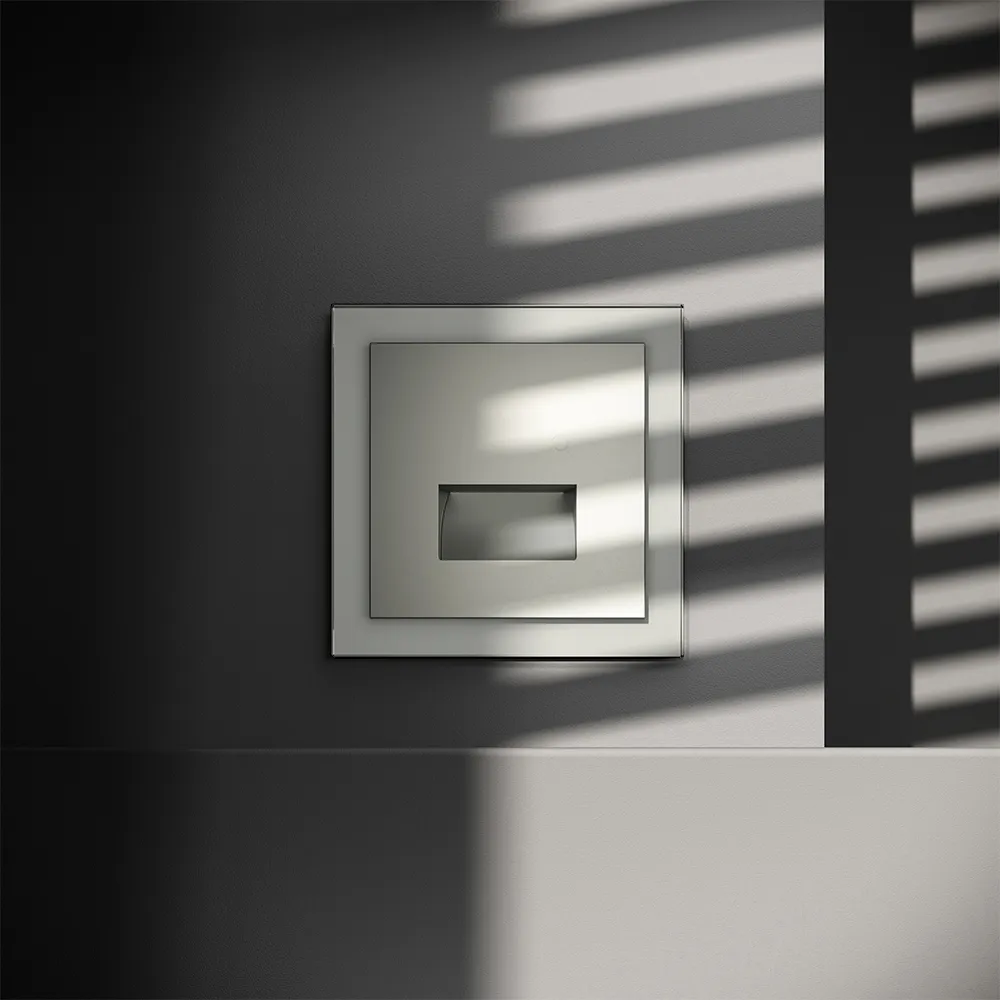 Подсветка устанавливается в стандартный подрозетник и совместима со всеми рамками серии S70 — пластиковыми и стеклянными, что позволяет интегрировать её в любую композицию на стене: рядом с выключателем, розеткой или терморегулятором.