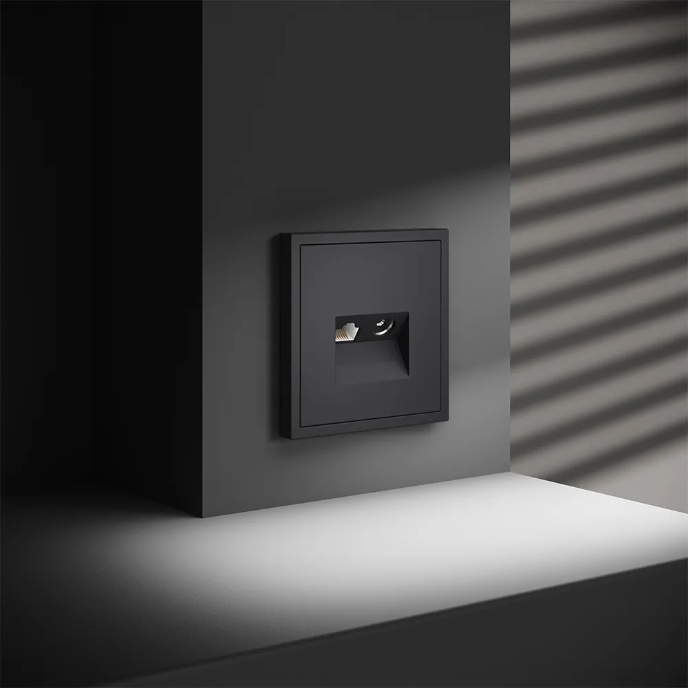 Цвет «графит» с покрытием Soft touch добавляет стене выразительности без агрессии. Насыщенный тёмно-серый оттенок идеально сочетается с современными интерьерами — создаёт контраст на светлых стенах и гармонично вписывается в монохромные композиции. Габариты 70,8 × 70,8 мм и монтажная глубина 40 мм позволяют полностью скрыть механизм в стандартном подрозетнике.
