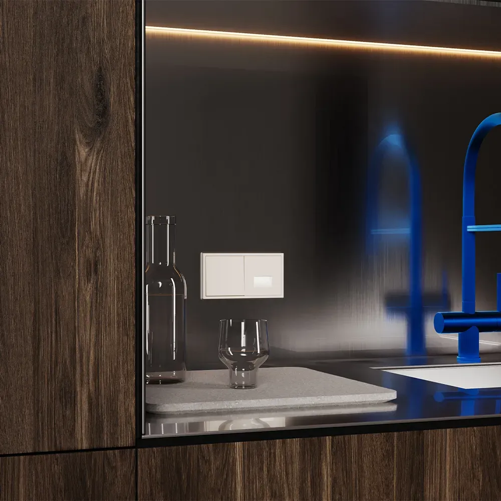 Проходной переключатель полностью совместим с пластиковыми и стеклянными рамками той же серии и гармонично вписывается в любую композицию из розеток, выключателей и умных устройств VOLTUM S70.